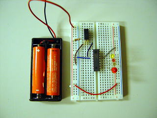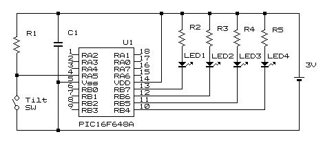 振動スイッチをRA5(4ピン)に接続する。このRA5ピンは抵抗R1によってプルアップされており、スイッチがオープン(OFF)の時にHigh(1)、クローズ(ON)の時にはLow(0)の値を得る。また、LED1から4の発光ダイオードは、抵抗器を介してアノード側を電源3Vに、カソード側をマイコンに接続している。マイコンにおいて0(ゼロ)を出力した時、LEDの両端子間には電圧差が生じるため、LEDは点灯する。