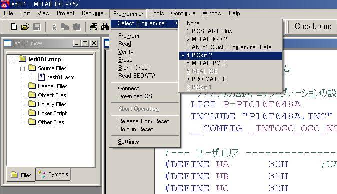 あらかじめMPLABを起動し、書き込み対象のプロジェクトを開く必要があります。次にメニューの[Programmer]より[Select Programmer]-[4 PICkit2]を選択し、項目の左側にチェックをつけた状態にします。MPLABとPICライター間の通信を確立するには、[Programmer]-[Connect]を一度実行する必要があります。