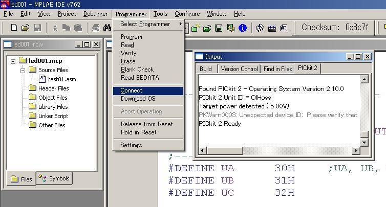 Fig.4 MPLABにおいてPICライターとの通信を確立(Found PICkit 2 と表示される)