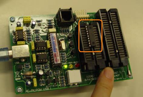PICマイコンをライターのソケットに挿してレバーを下ろします。PIC16F648Aの場合は左側のソケットを使い、ソケットの上部に(1番ピンと18ピンが最上部にくるように)合わせます。