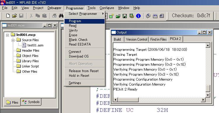 書き込みが終了すると、Outputウィンドウに「PICkit 2 Ready」と表示されます。書き込み(Programming)が成功しているかどうかを確認して下さい。書き込みが正常に行われていない場合は、赤色でメッセージが現れます。