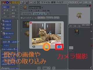 いずれかのスプライトを選択して、コスチュームのタブに切り替えます。次に「カメラ」のボタンを押します。2.カメラアクセスの許可