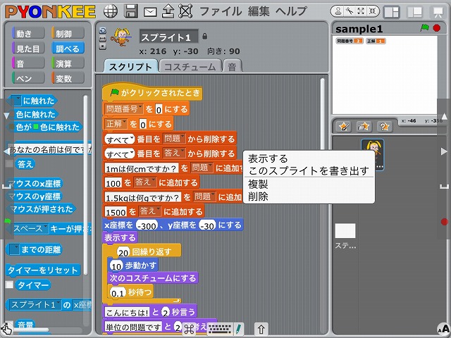 プログラム(スクリプト)が長くなると、開発環境の動作が遅くなり、ブロックの追加や修正が難しくなります。その解決策として、スプライトを複製し、スクリプトを分けて記述する方法があります。このページでは、第1回の授業で紹介した「単位の問題」を例にその方法を紹介します。