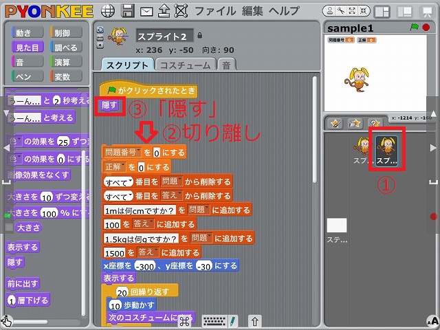 右下のスプライト・リストにおいてスプライト2を選択します。次にスプライト1に残したスクリプトを削除するため、「緑の旗をクリックされたとき」の下を一旦切り離します。次に開始時にスプライト2側のピョンキーが表示されるのを避けるため、見た目のカテゴリから「隠す」のブロックを取り出し、「緑の旗をクリックされたとき」の下に取り付けます。6.スプライト2の変更(2)