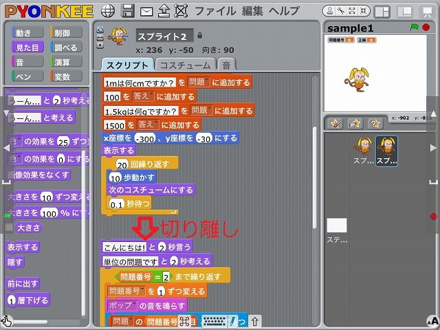 スプライト1において残したスクリプトの範囲を確認して切り離しを行い、スプライト1と重複するスクリプトを左側のブロックパレットへ移動して削除します。7.スプライト2の変更(3)