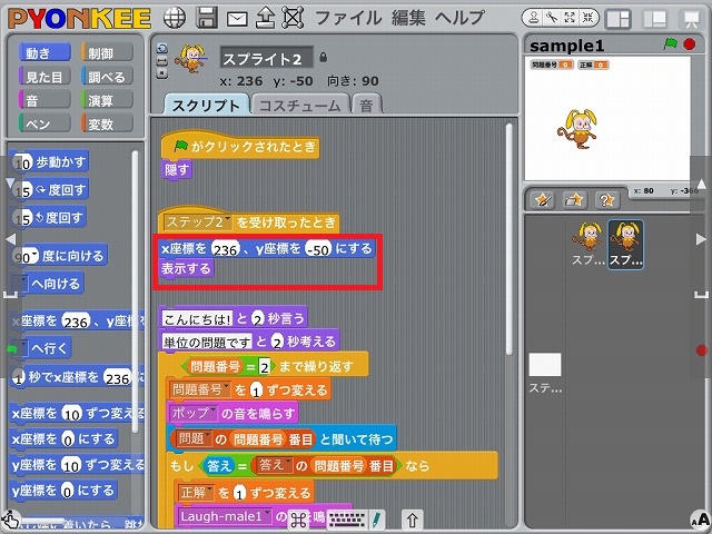 制御のカテゴリから「ステップ2を受け取ったとき」のブロックを取り出し、上部に配置します。次に、スプライト2のピョンキーの座標を決めるため、動きのカテゴリから「x座標を( )、y座標を( )にする」ブロック、見た目のカテゴリから「表示する」ブロックを取り出し、追加します。最後に、スプライト2において残すスクリプトを「表示する」のブロックの下に取り付けます。サンプルデータのダウンロード:sample5.sb ※さらにプログラムが長い場合は、スプライト2を複製し、同様の切り離しやメッセージのブロック(「ステップ3を送る」と「ステップ3を受け取ったとき」)の追加を行って下さい。