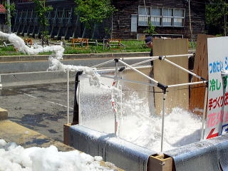 H14年度の活動 雪山を作り雪の長期保存を試みました。断熱材にはもみ殻を使用し、もみ殻ふとんの利用も検討しました。