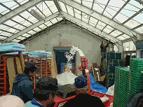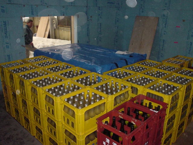 H16年度の活動 既存の倉庫を利用した雪室(2年目)。貯蔵スペースが1.5倍に拡張され、雪の投入口を天井付近に設けました。また、U字構内への出入りも可能になり、日本酒は4号瓶で2千本が貯蔵されました。