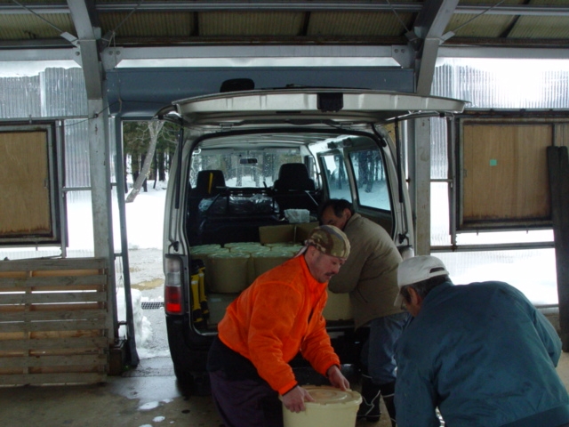 ”屋内式の雪室”も今年で7年目をむかえます。本日、20kgの味噌を15樽(計300kg)と日本酒4合瓶1000本を運び入れました。