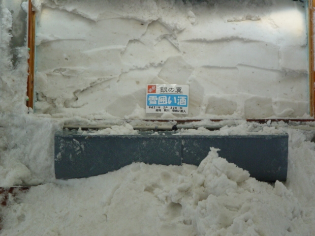 周囲の雪を集め、除雪機で投入しました。今回は日本酒の貯蔵量が減った分、雪が多めになっています。(約40t)