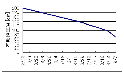 既存の倉庫を利用して屋内型雪室を製作し、施設運用を試みました。今年度は、冷夏に救われ9月下旬まで雪を残すことが出来たが、例年の気象条件では9月上旬が限度と考えらます。今後、商業的な利用を進める上で解決が望まれる点としては、 1)1年越しの貯蔵にも堪えうる雪を確保する。(別途確保または施設の拡張) 2)貯蔵品搬入出を容易にする(短期貯蔵品を対象)。 が挙げられます。
