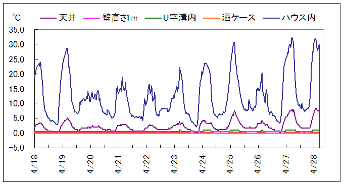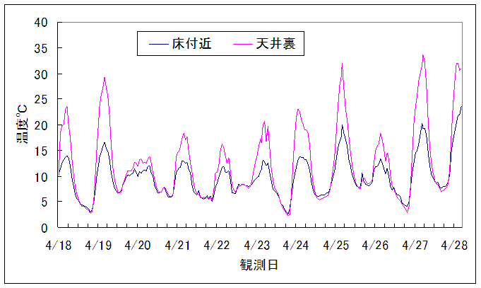 4/18よりU字溝搬入口のある倉庫(雪室外)で床付近と天井裏の温度を計測しています。温度差は最大で約15℃、平均で約3℃になっています。