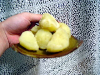 こちらは、雪室に貯蔵し、今回取り出したリンゴとジャガイモです。リンゴは、酸味が失われていますが、サクサクとした食感は健在です。皮が張り、取れたて同様の弾力感があります。ジャガイモは写真のように蒸かして頂きました。サツマイモのような甘さが感じられ、不思議な思いを致しました。