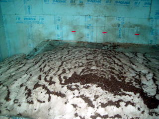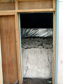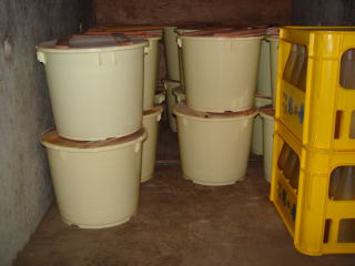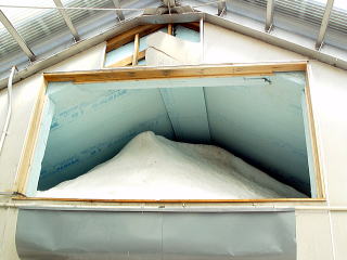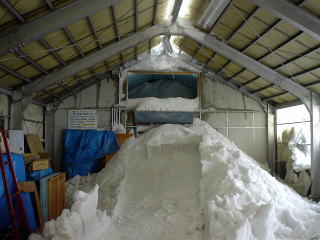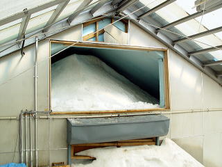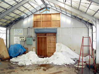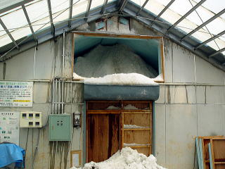 味噌は20Kgの樽が20ケ、合計で400Kgが収められました。また、上部の投雪口は当日午前に閉じました。下2枚の写真は、閉じる前の状況です。雪の投入から3週間あまり経っていますが、殆ど上部の雪は減っていません。