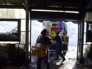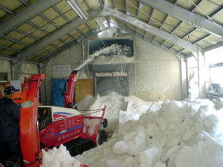 9時より作業を開始。日本酒は4号瓶で1000本、一升瓶で1000本が搬入されました。その後、除雪機を使い、雪の投入が行われました。最下部は、投入開始より2時間後の状況です。約30tの雪が投入されました。味噌は、20日(月)に搬入予定です。