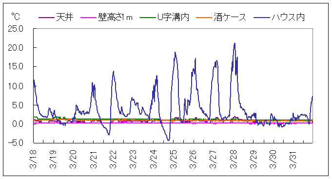 上の図は、3/14から2週間の状況です。ハウス内の気温は平均3.8℃。20℃を超える日もありました。雪室内は平均1℃で安定しており、U字溝内の湿度は78%を示していました。