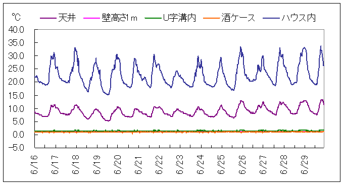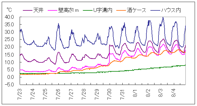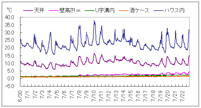 上の図は、6月30日から7月23日までの温度観測結果を示します。23日10時の観測では、天井付近14.9℃、U字溝付近で2.2℃(湿度92%)、酒ケース付近で1.6℃となっています。