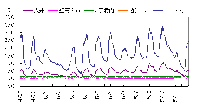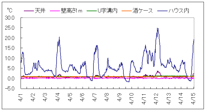 上の図は、4月1日から4月15日までの状況です。気温が20℃を超える日は天井の温度が若干上がるようになってきました。U字溝は平均1℃、湿度は80%でした。