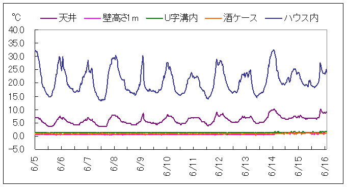 上の図は、6月5日から6月16日までの温度観測結果を示しています。平均温度は、天井付近で6℃、雪室U字溝付近で1℃。建物周辺は平均で20℃を示しています。