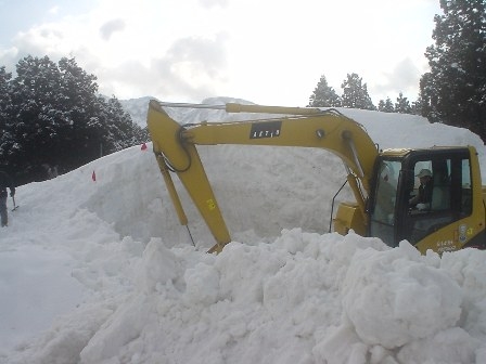 重機を利用して雪山を崩す