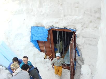 翌日の日本酒搬出に備えて扉前の雪を除雪しました。この時点で70tあまりの雪が残っているものと思われます。