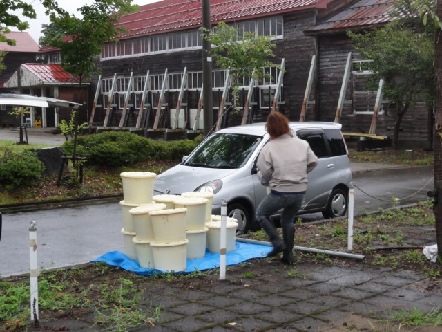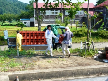 手渡しでコンテナへ運び入れる