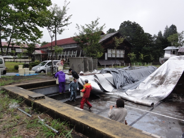 雪室の雪解けを遅らせるため、断熱材やシートで雪山を覆う作業を行いました。また、風対策のため、ネットを最後に被せています。
