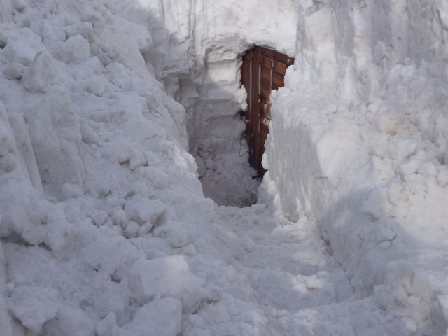 明日の日本酒搬出に備えて貯蔵庫扉前の雪を一時取り除きました。