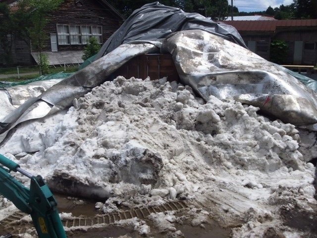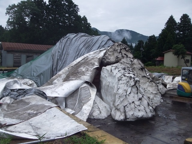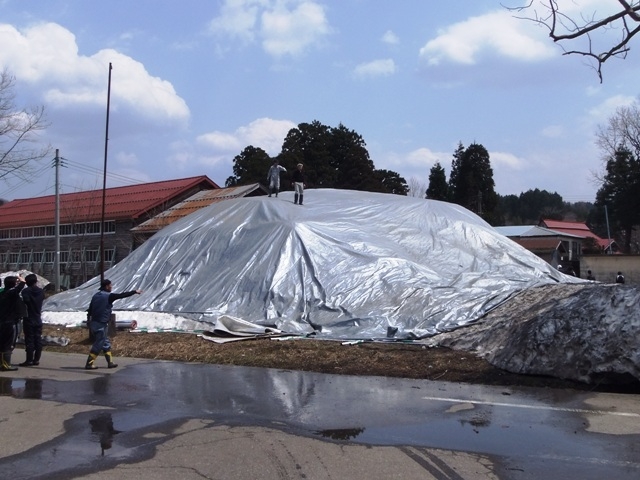 これからの気温の上昇に備え、断熱材やシートを雪山に掛けました。