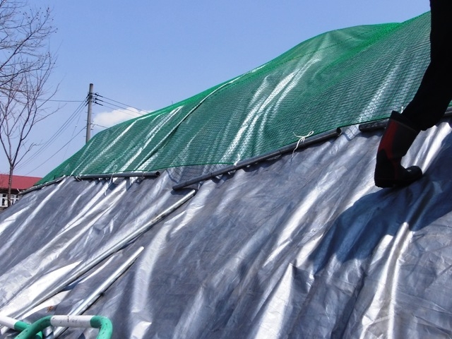 ネットの端に単管を結びつけ、風でシートがめくれるのを防ぐ
