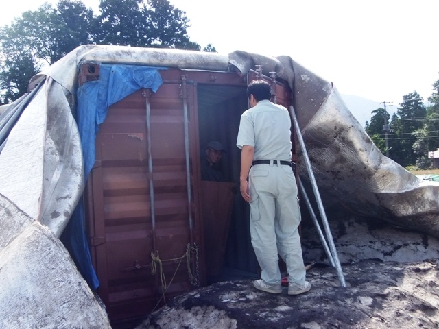 貯蔵室(コンテナ)の中が一杯になりました。米は、扉に近い位置に置かれ、ブルーシートが掛けられています。