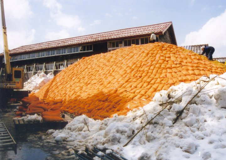 上の写真は、平成14年度に屋外で製作した雪室です。断熱材として、もみ殻ふとんの利用を検討しました。